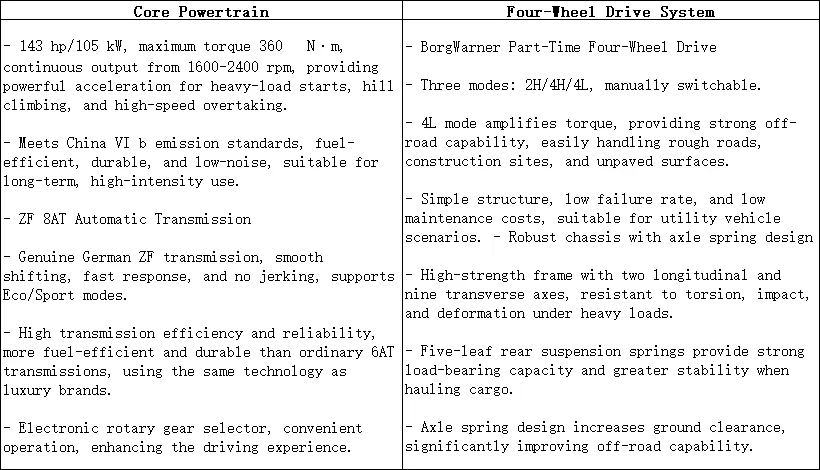 مدل 2026 RE-MAX 2.5T اتوماتیک 4WD دارای مزایای اصلی موتور دیزل ایسوزو 2.5T + گیربکس ZF 8AT + شاسی پاره وقت 4WD + HanDun BorgWarner است که بر سهولت استفاده، 4WD قابل اعتماد، کت و شلوار سنگین برای دوام، استفاده تجاری و خانوادگی تاکید دارد.
